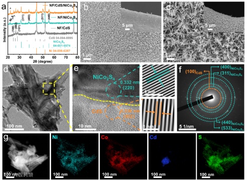 图2展示了CdS/NiCo2S4异质材料的物理特性。图 2a 为 X 射线衍射图,可验证材料的成功合成。通过扫描电镜对材料进行表征,以研究其微观结构。图 2b-c 显示 CdS/NiCo2S4的层次化结构。TEM、SAED和EDX测试结果进一步佐证高结晶度CdS/NiCo2S4异质材料具有明显的层次化结构。