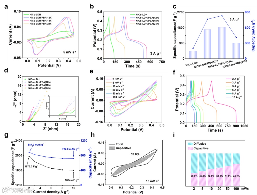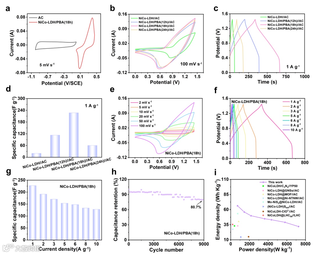 该研究首先采用电沉积法在泡沫镍表面制备了NiCo-LDH纳米片,然后通过离子交换法在NiCo-LDH表面包覆PBA。通过调节离子交换时间,形成了具有球形花状结构的NiCo-LDH/PBA异质结构,暴露出大量的氧化还原活性中心。最佳的NiCo-LDH/PBA(18 h)电极在2和10 A g-1下的比电容分别为1973.0和1604.4 F g-1。NiCo-LDH/PBA(18 h)和活性炭(AC)组装成非对称超级电容器(ASC),表现出良好的能量密度(66.3 Wh kg−1)和功率密度(725.0 W kg−1)特性,9000次循环后容量保持率为80.7%。这些优异的性能使NiCo-LDH/PBA成为最有前途的SC电极材料之一。