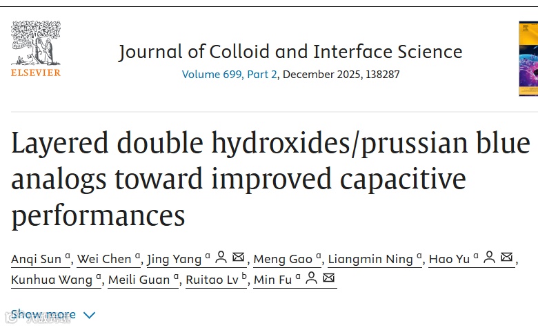 近日,来自山东科技大学的付民和于昊等人,在国际学术期刊Journal of Colloid and Interface Science上发表题为“Layered double hydroxides/prussian blue analogs toward improved capacitive performances”的研究型文章。