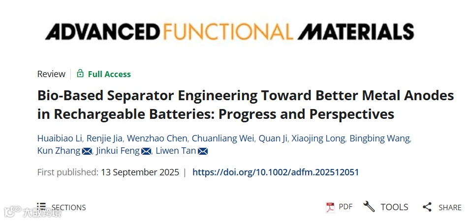 近日,青岛大学谭利文副教授与山东大学冯金奎教授、浙江大学张坤博士合作,在国际知名期刊Advanced Functional Materials上发表题为“Bio-Based Separator Engineering Toward Better Metal Anodes in Rechargeable Batteries: Progress and Perspectives”的观点文章。该文章分析了当前生物基隔膜在提升金属负极稳定性方面的作用机理,重点关注其对隔膜-电解液与隔膜-负极界面的影响,系统综述了其在不同电池体系中的应用现状并探讨了其面临的问题与未来发展趋势。