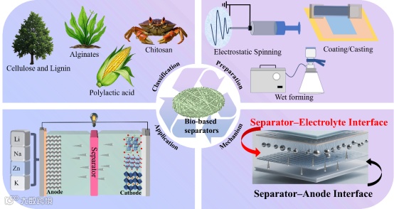 图1. 生物基隔膜的分类、制备方法、应用以及其在不同界面的作用机理。