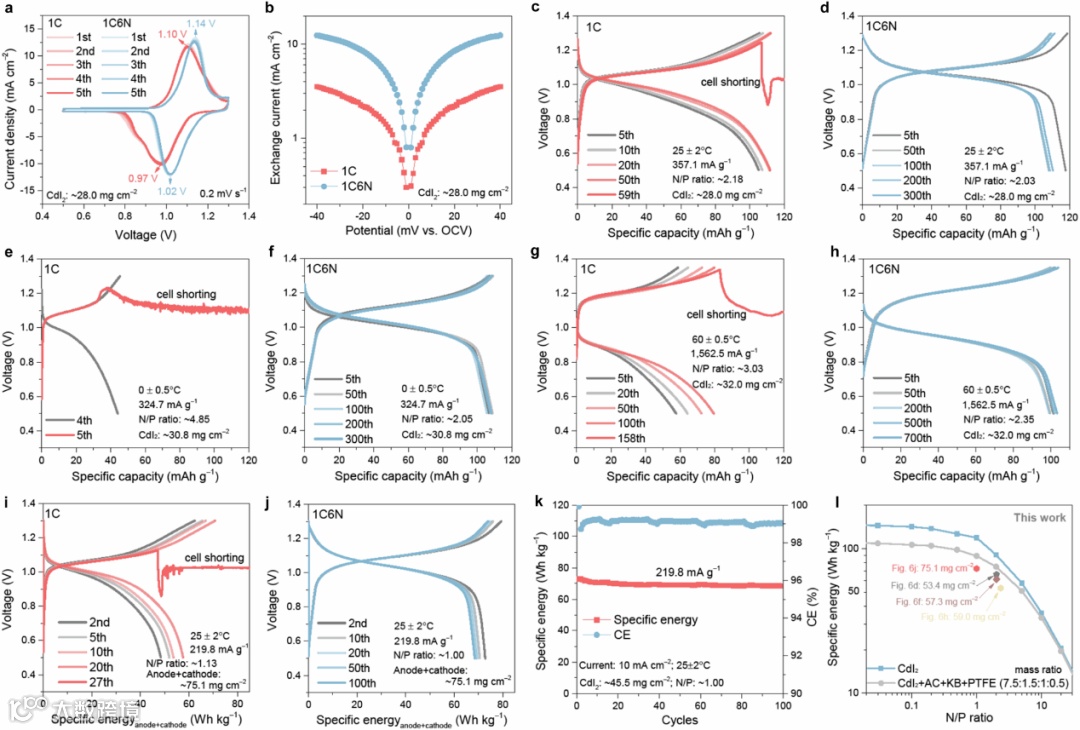 Fig. 6: Rechargeable capability of high-loading Cd||CdI2 full cells in 1 C and 1C6N electrolytes.