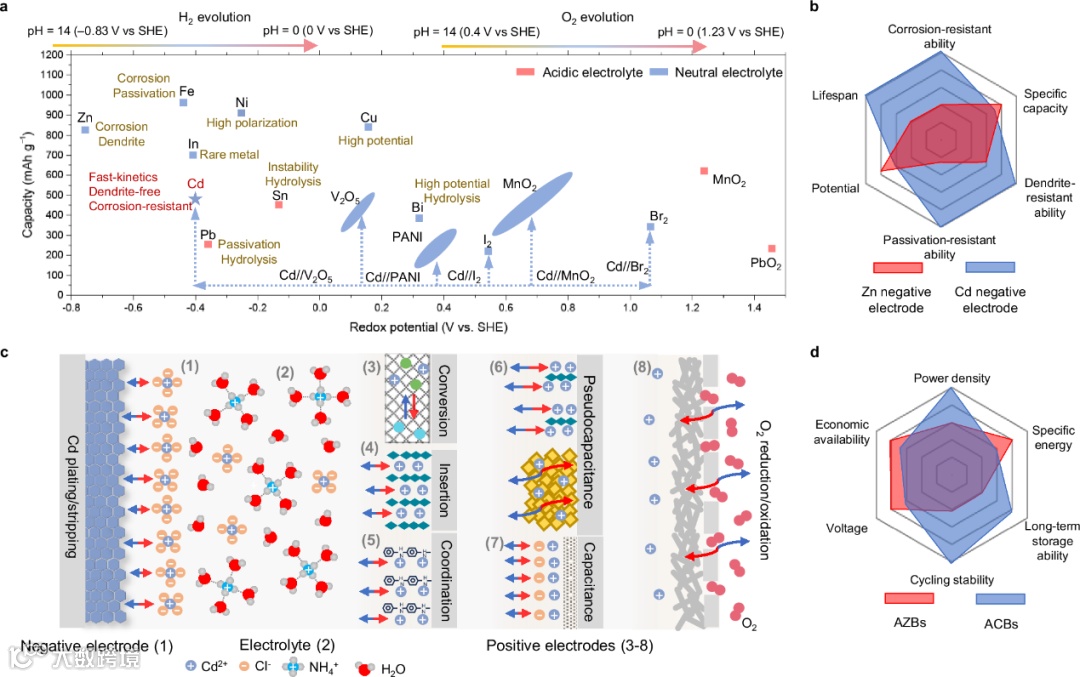 水系金属电池因其高安全性与低成本而备受关注,尤其适用于可再生能源的大规模储能。然而,金属负极在水中普遍面临枝晶生长与腐蚀的严重挑战,制约了其实际应用。相比之下,镉(Cd)作为一种兼具抗枝晶、抗腐蚀和多电子转移能力的金属,具备成为水系储能体系负极的巨大潜力,但如何实现其高效可逆沉积/剥离仍缺乏有效电解液设计。