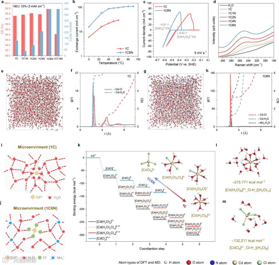 该体系中,NH4+ 和 [CdCl4]2- 两类结构破坏离子的协同作用,破坏了水的氢键网络、降低了溶液黏度,并显著提升了电荷转移动力学,使得电解液在保持高Cd利用率(55%)的同时,实现了 99.93% 的电化学效率和超过 229小时的循环稳定性。