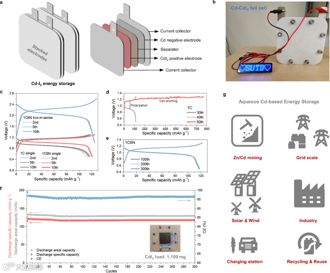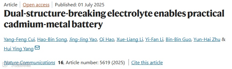 近日,新加坡科技设计大学杨会颖教授团队在《Nature Communications》发表研究成果,报道了一种由 CdCl2 与 NH4Cl 构成的双结构破坏型电解液(SBE),成功实现了高效、无枝晶、抗腐蚀的可逆Cd电沉积与剥离。