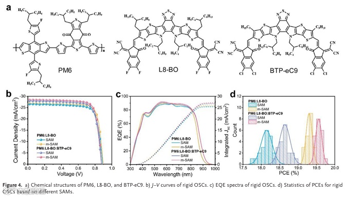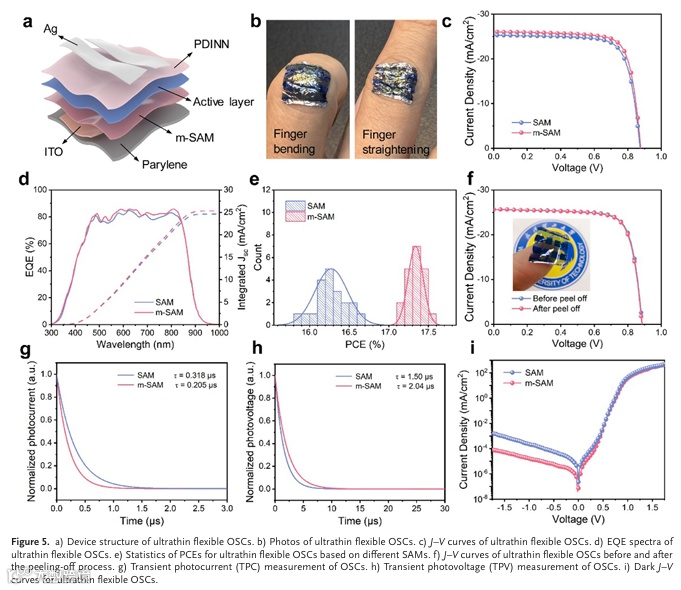 超薄柔性有机太阳能电池(Ultrathin Flexible Organic Solar Cells)因其具备良好的溶液可加工性、优异的机械柔韧性以及出色的共形贴附能力,被视为可穿戴电子设备中极具潜力的供能方案。近年来,自组装单分子层(Self-Assembled Monolayers, SAMs)由于在界面调控方面表现出显著优势,已被广泛应用于高性能薄膜太阳能电池中,常作为空穴传输层材料使用。然而,在超薄柔性有机太阳能电池领域,SAMs的应用研究仍相对有限,面临诸多技术挑战。