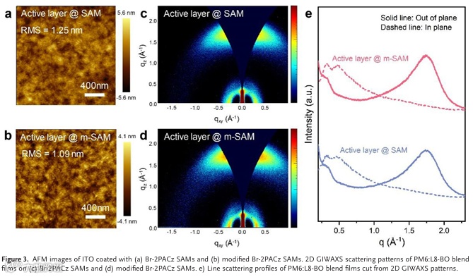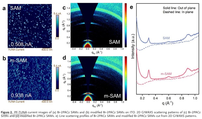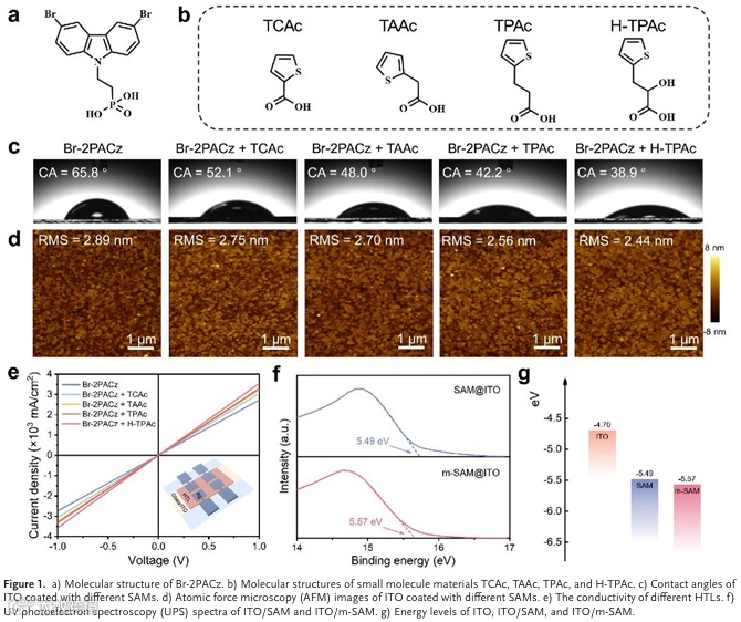 其中,一个关键问题在于传统SAMs材料在柔性氧化铟锡( Indium Tin Oxide, ITO)电极表面易发生聚集现象,从而导致表面覆盖率不足和界面稳定性下降。针对该问题,武汉理工大学黄文超教授团队提出了一种创新的小分子修饰策略:通过在Br-2PACz SAMs中引入H-TPAc小分子,成功制备出具有优异界面特性的改性SAMs材料。该材料能够在柔性ITO电极表面实现高度均匀的自组装分布,显著提升了器件的光电转换效率与机械耐久性。