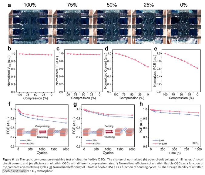 基于该界面工程策略,研究人员分别制备了刚性和厚度小于3微米的超薄柔性有机太阳能电池,其能量转换效率分别达到19.7%和17.5%。此外,柔性器件在经历2000次弯曲循环测试后仍保持初始效率的94.0%,在经历相同次数的压缩-拉伸循环后仍可维持初始效率的90.0%。实验结果表明,该方法在提升器件性能与机械稳定性的双重目标上取得了实质性突破。
