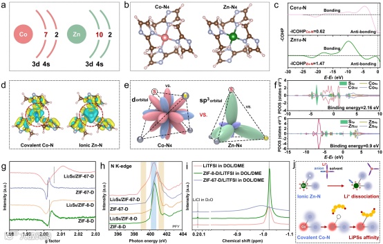图2. Zn-N离子键促进壳层Li+扩散,Co-N共价键锚定核芯多硫化锂