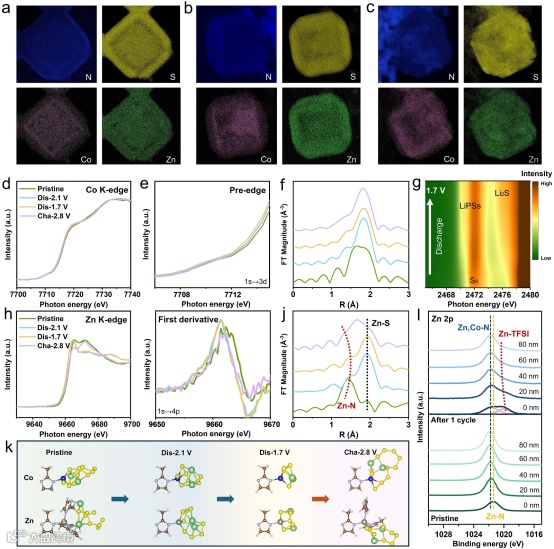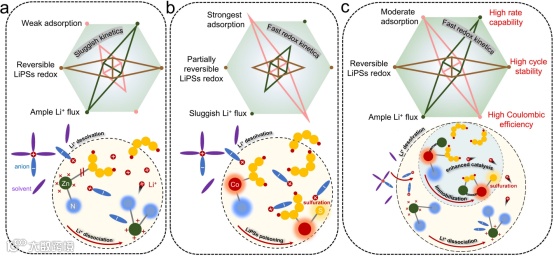 将具有离子键特性的Zn−N键分布于壳层以促进Li+迁移,而将具有共价键特性的Co−N键分布于核芯以增强LiPSs的锚定与双向催化能力。该设计充分发挥了离子Zn的TFSI-吸附与解离能力,以及Co在LiPSs自适应重构过程中的电子结构调控优势,实现了在空间上分离Li+传输路径与LiPSs催化位点,从而促成了空间-时间协同的LiPSs自串联催化过程。