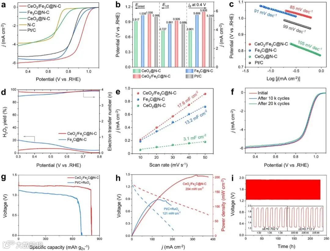 CeO2/Fe3C@N-C表现出高达0.926 V的半波电位以及超过20,000次的循环耐久性,这优于商用Pt/C和大多数报道的Fe3C基电催化剂。此外,CeO2/Fe3C@N-C作为空气正极的锌空气电池表现高达204 mW·cm-2的功率密度。