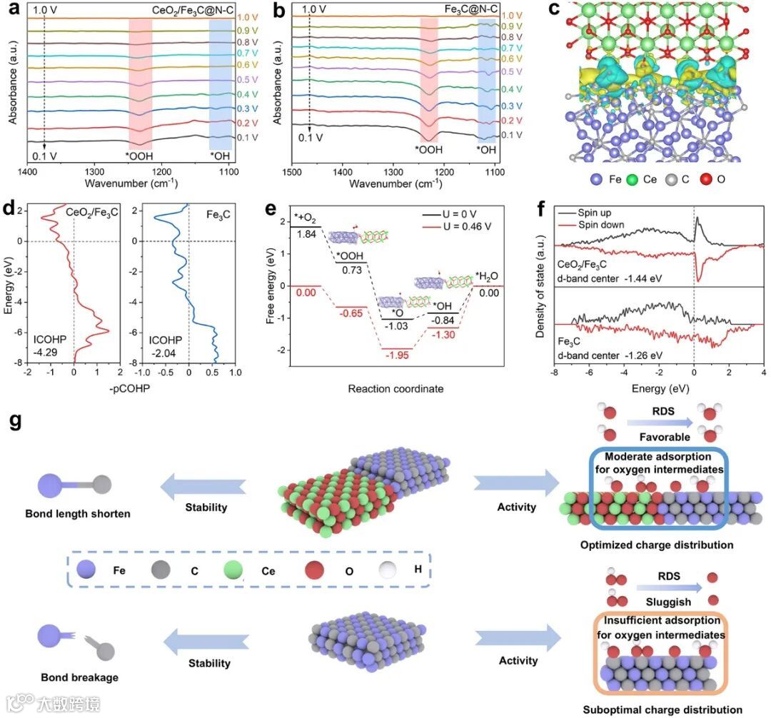 CeO2作为电子供体,在CeO2/Fe3C界面处诱导电子重新分布,导致电子在Fe活性位点聚集。这种电子富集减轻了Fe-C键局部电荷不平衡,增强了键强并有效抑制了ORR过程中Fe的溶解。