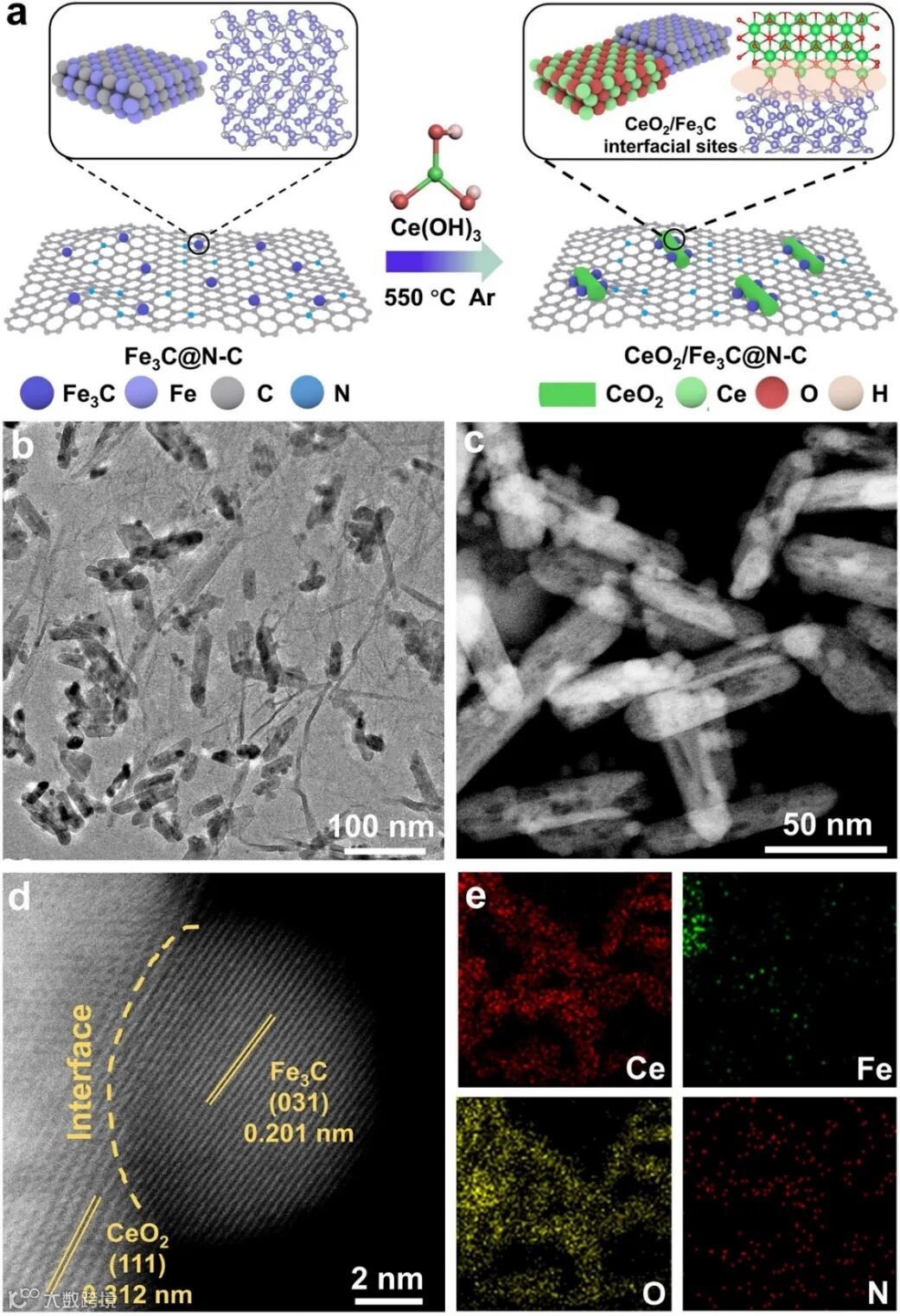 图1. CeO2/Fe3C@N-C催化剂的合成路线和形貌表征。
