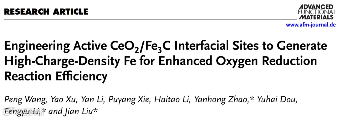 近日,内蒙古大学刘健、赵彦宏、李锋钰教授在国际知名期刊Advanced Functional Materials上发表题为“Engineering Active CeO2/Fe3C Interfacial Sites to Generate High-Charge-Density Fe for Enhanced Oxygen Reduction Reaction Efficiency”的研究论文。该研究工作通过构建CeO2/Fe3C异质结构,以产生协同界面位点,从而诱导电荷再分配并优化Fe的电子结构。最终赋予了催化剂优异的ORR催化活性和耐久性。