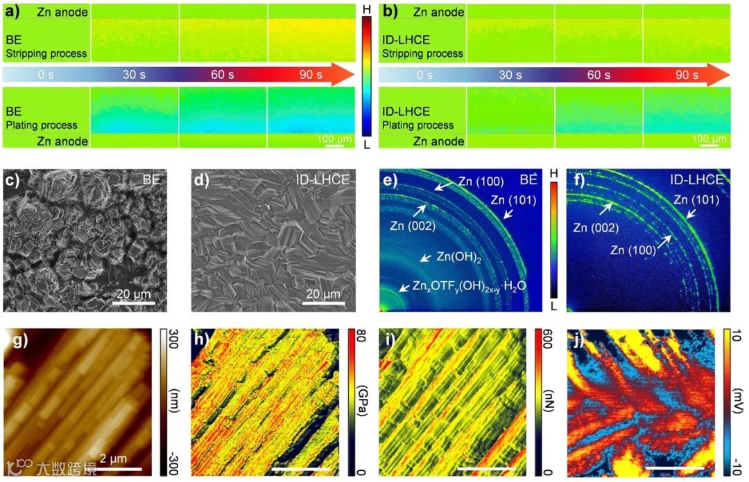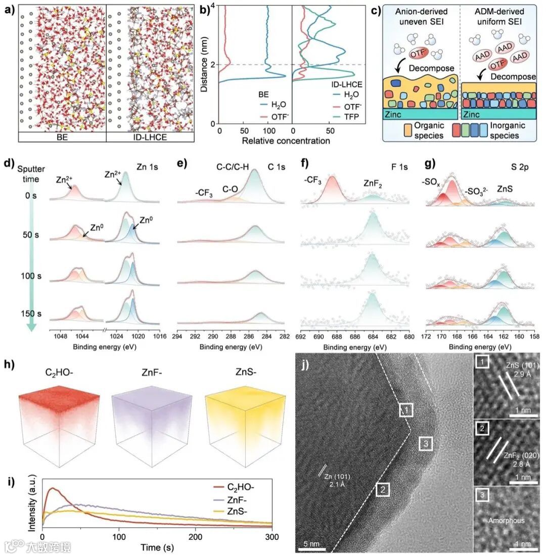 将ADM引入ID-LHCE电解质,使得OTF⁻能够适度地参与Zn²⁺的溶剂化结构。这种构型促进了OTF⁻优先且直接地参与界面反应,同时减轻了因阴离子过度聚集而导致的持续的、不完全的分解。ADM有效重构了一个贫水、富含阴离子-稀释剂的界面相(图4a-b),促进形成有机-无机复合的有序且均一的SEI,兼具高Zn²⁺电导率和优异机械稳定性的双重优势,这从根本上改善了锌沉积/剥离过程的电化学可逆性。