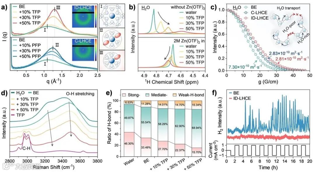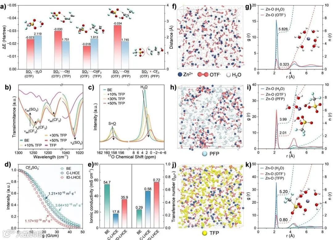 PFP无法为Zn2+、OTF-提供独立的溶剂化环境,因此PFP在该工作中可被认为惰性稀释剂,组成了经典的LHCE(C-LHCE)。而在离子解耦型局部高浓电解质(ID-LHCE)中,TFP在维持Zn²⁺富集的亲水纳米域固有特征的同时,主导构建了稳定的阴离子-稀释剂配位结构,称为阴离子亲和型稀释剂(AAD)。阴离子在热力学驱动下与AAD发生空间富集,形成独特的阴离子-稀释剂基质(ADM),同时实现阴离子解离的Zn²⁺溶剂化结构(即OTF⁻从Zn²⁺溶剂化壳层中释放)(图1c, f)。