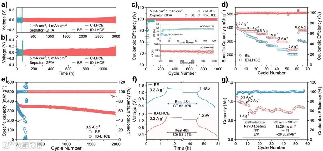 在1 mA cm⁻²/1 mAh cm⁻²和5 mA cm⁻²/5 mAh cm⁻²条件下,基于ID-LHCE的对称电池表现出卓越的循环能力,寿命分别超过3000小时和1150h。在Zn||Cu半电池测试中,ID-LHCE体系的锌CE快速收敛至99.88%并持续超过1000次循环(5 mA cm⁻²/1 mAh cm⁻²)。采用ID-LHCE的全电池在0.5 A g⁻¹下初始放电容量达380.17 mAh g⁻¹,室温循环2000次后容量保持率为72.5%。而使用BE的电池在158次循环后容量急剧衰减至60.7%,并伴随致命的微短路现象。此外,在高电流密度(2 A g⁻¹)下,ID-LHCE体系循环2000次后容量保持率达89.5%,4000次后仍保持79.0%,远优于性能快速衰退的BE体系。