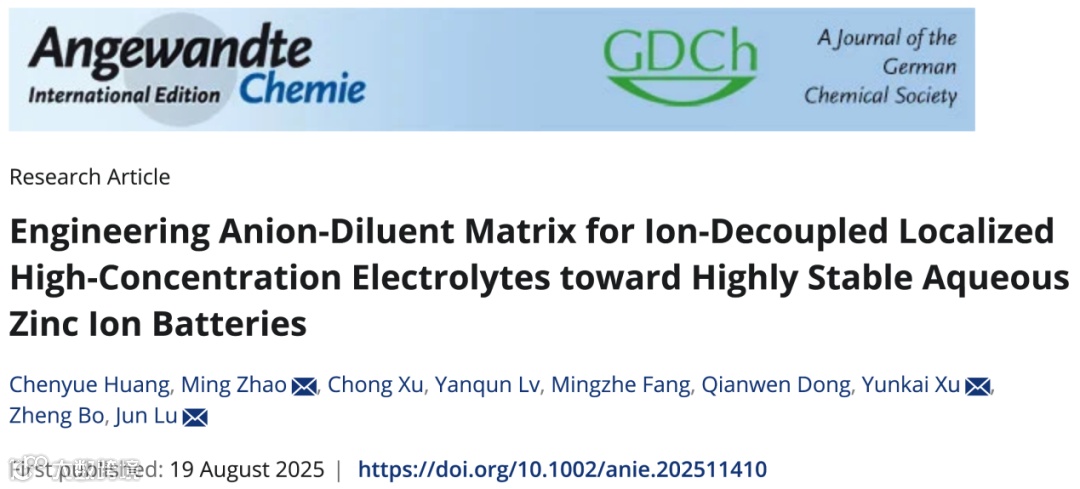 近日,浙江大学陆俊教授、赵明、徐云凯研究员在国际知名期刊Angewandte Chemie International Edition上发表题为“Engineering Anion-Diluent Matrix for Ion-Decoupled Localized High-Concentration Electrolytes Towards Highly Stable Aqueous Zinc Ion Batteries”的研究性文章。该文章设计了“阴离子-稀释剂基质”,实现局部高浓电解质中的阴-阳离子解耦,在维持局部高Zn2+浓度的同时实现快速离子传输。