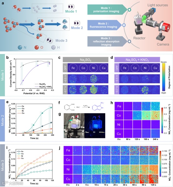 为探究四种泡沫电极在 NO₃RR 中的行为特征,研究采用原位光学检测三种模式,分别监测反应过程中 H₂、NH₃和 NO₂⁻的生成。其中,原位偏振成像用于评估 H₂气泡演化,荧光成像监测 NH₃实时浓度,反射吸收成像观察中间产物 NO₂⁻的形成。同时,结合扫描电子显微镜(SEM)、X 射线衍射(XRD)等材料表征方法,以及线性扫描伏安法(LSV)、恒电位测试等电化学分析手段,全面评估电极的催化性能。