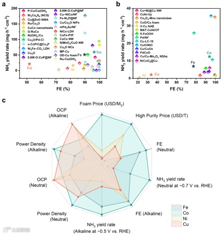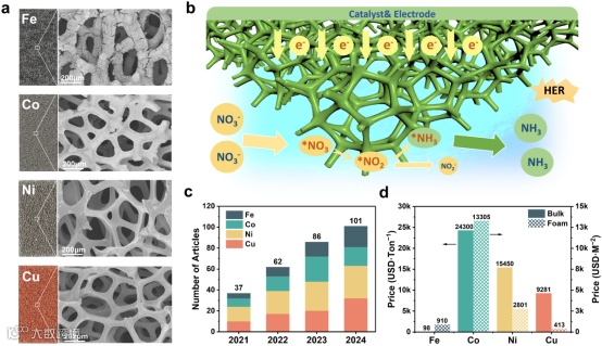 氨是农业肥料生产和众多工业应用中不可或缺的关键化工原料,然而传统的哈伯 - 博施法合成氨存在高能耗和严重环境污染的问题,难以满足当前的能源与环境需求。与此同时,硝酸盐在农业和工业废水中的过量排放已成为全球性环境威胁,带来严重的生态风险。在此背景下,电化学硝酸盐还原反应(NO₃RR)作为一种既能实现可持续氨合成又能修复硝酸盐污染废水的双重解决方案,受到了广泛关注。不过,NO₃RR 的催化路径因催化剂表面不同而存在差异,影响产物生成的动力学和选择性,因此亟需建立常用催化剂间统一的性能量化标准。金属泡沫电极因其优异的导电性、高比表面积和催化活性,常被用作催化剂或基底,但目前相关研究中存在数据差异大、缺乏标准化协议、对反应中间产物动态变化研究不足等问题,阻碍了反应条件优化和机理理解。