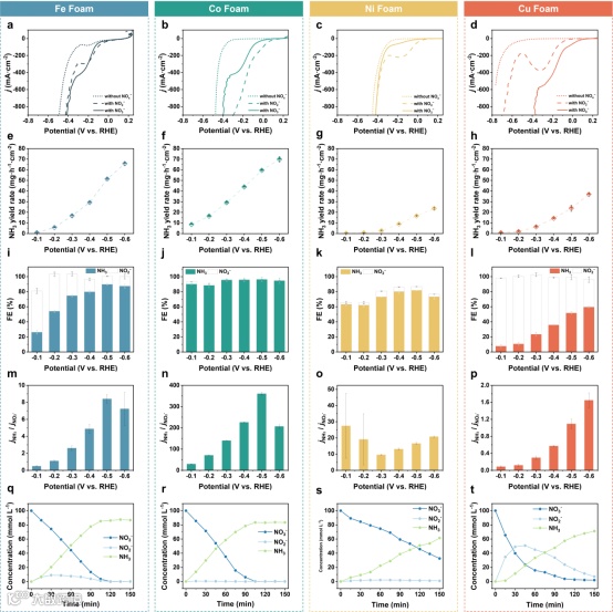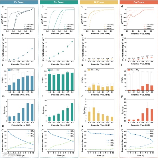 图4.中性条件下金属泡沫电极的硝酸盐还原反应性能