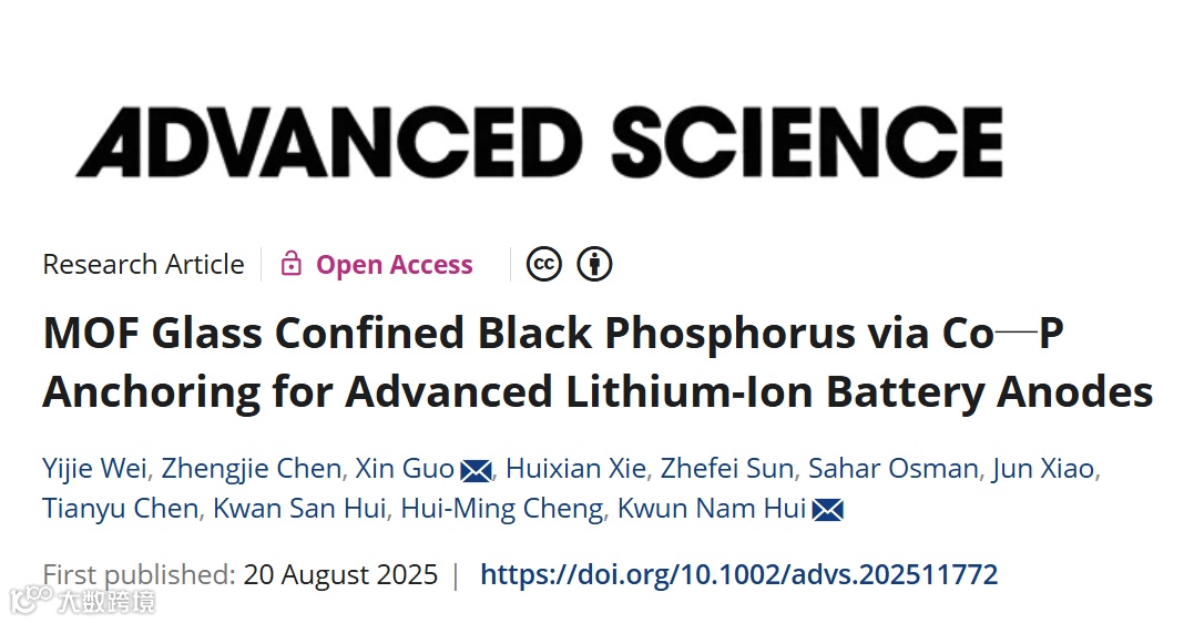 近日,来自深圳理工大学院士工作站成会明教授、郭鑫教授与澳门大学的许冠南教授合作,在国际知名期刊Advanced Science上发表题为“MOF Glass Confined Black Phosphorus via Co─P Anchoring for Advanced Lithium-Ion Battery Anodes”的研究文章。该文章报道了一种通过原位玻璃化制备的复合阳极材料,其中BP纳米颗粒和碳导电网络嵌入在MOF玻璃基体中。在这种复合结构中,BP被封装在MOF玻璃基体中,并通过Co─P键牢固地锚定在Co位点上,形成稳定的BP/CoP异质结构,而导电网络则在MOF玻璃中建立连续的电子和离子传输途径。该结构不仅有利于优化电化学动力学并成功实现对深埋于MOF玻璃内部的锂离子存储位点的预活化,还有效缓解了BP的体积变化。因此,该复合材料表现出显着增强的比容量和优异的循环稳定性,为高性能合金/MOF玻璃复合阳极材料的设计提供了一种新策略。