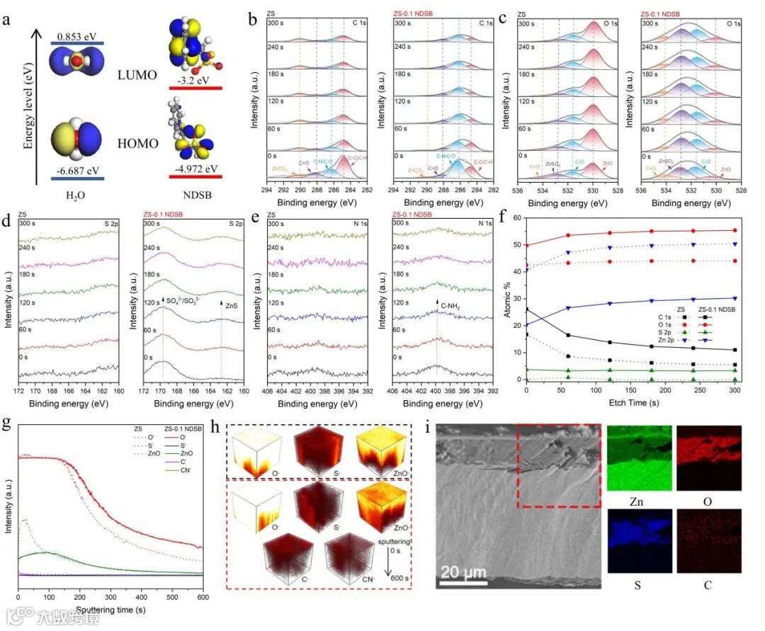 图4.(a)H2O和NDSB分子的最高占据分子轨道(HOMO)与最低未占据分子轨道(LUMO)能级。(b)在1 mA cm-2电流密度和1 mAh cm-2面积容量下循环100次的Zn负极,经 Ar+溅射 0、60、120、180、240和300秒后的C 1s、(c)O 1s、(d)S 2p 和(e)N 1s 高分辨率X射线光电子能谱(XPS)深度剖析光谱。(f)在ZS和ZS-0.1 NDSB电解液中循环的Zn负极表面成分随Ar+溅射时间增加的变化。(g)Cs+离子溅射的飞行时间二次离子质谱(ToF-SIMS)深度剖析。(h)在ZS和ZS-0.1 NDSB电解液中循环的Zn负极表面特定成分的ToF-SIMS三维视图。(i)在1 mA cm-2电流密度和1 mAh cm-2面积容量下循环10 次 Zn电极的聚焦离子束扫描电子显微镜(FIB-SEM)表征及相应能量色散 X 射线光谱(EDX)元素映射。