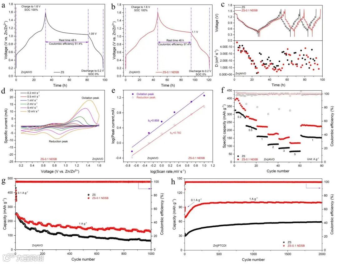 图5.(a)不含和(b)含NDSB添加剂的ZS电解液中Zn||AlVO全电池的自放电曲线。(c)AlVO电极充放电过程中的恒电流间歇滴定技术(GITT)曲线及ZS和ZS-0.1 NDSB电解液中Zn2+的相应扩散系数。(d)使用ZS-0.1 NDSB电解液的Zn||AlVO全电池的循环伏安(CV)曲线及(e)各氧化还原峰处对数峰电流与对数扫描速率的对应关系图。(f)在 ZS 和 ZS-0.1 NDSB 电解液中循环的Zn||AlVO全电池的倍率性能。(g)使用ZS和ZS-0.1 NDSB电解液的 Zn||AlVO 全电池在1 A g-1电流密度下的长期循环性能对比。(h)使用ZS和ZS-0.1 NDSB电解液的Zn||PTCDI全电池在1 A g-1电流密度下的长期循环性能。