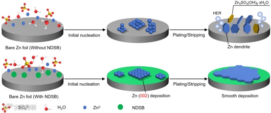 示意图1. 两性离子型添加剂NDSB对锌金属初始成核及后续循环过程锌负极界面的改善作用。