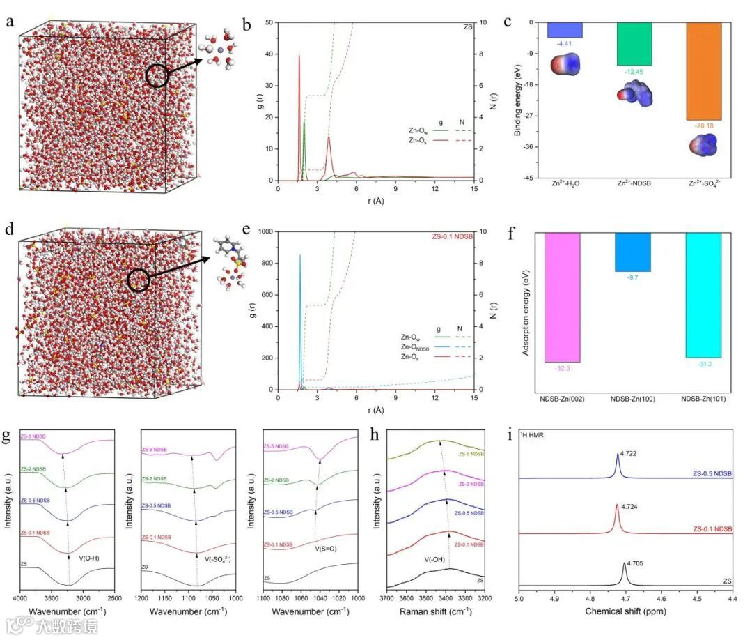 图2.(a)通过分子动力学模拟(MD)得到的ZS空白电解液的三维快照。(b)从分子动力学模拟中采集的 Zn-Ow(水分子)、Zn-O(硫酸根)的径向分布函数(RDFs)及Zn2+的相应配位数。(c)通过分子动力学模拟得到的 ZS-0.1 NDSB 电解液的三维快照。(d)从分子动力学模拟中采集的 Zn-Ow(水分子)、Zn-O(NDSB)、Zn-O(硫酸根)的径向分布函数(RDFs)及Zn2+的相应配位数。(e)Zn2+与 H₂O、NDSB、SO42-的结合能密度泛函理论(DFT)计算,插图为相应的静电势图。(f)NDSB 在锌不同晶面上的吸附能。(g)ZS 空白电解液及添加不同剂量 NDSB 添加剂的改性电解液的傅里叶变换红外光谱(FT-IR)和(h)拉曼光谱。(i)ZS、ZS-0.1 NDSB和ZS-0.5 NDSB电解液的1H核磁共振光谱。