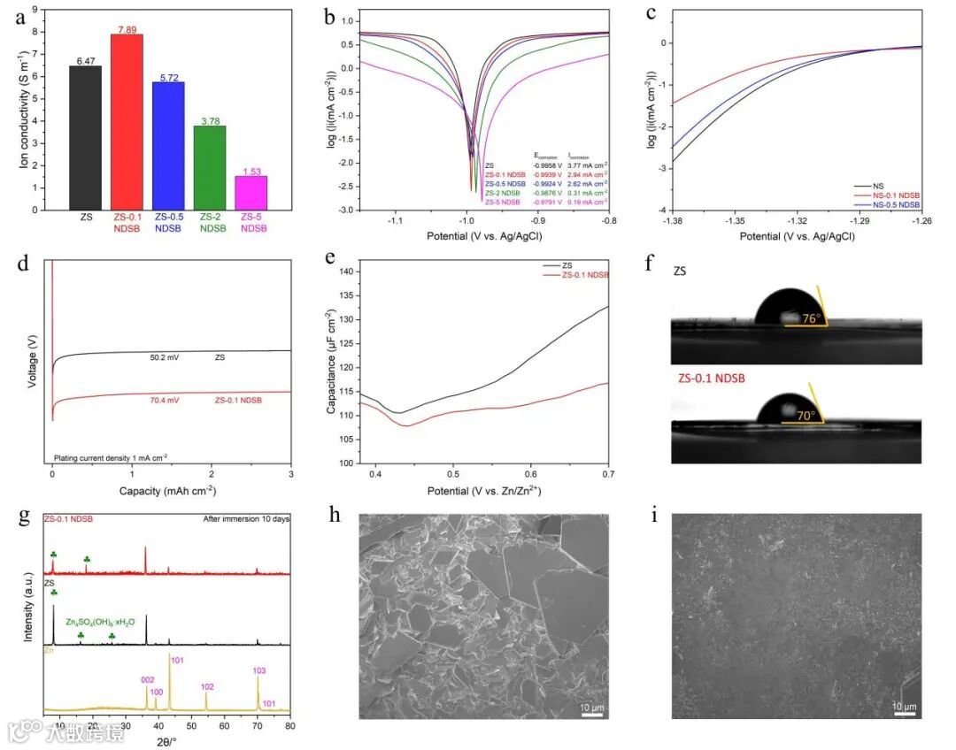 图1.(a)空白ZS电解液及添加不同剂量NDSB添加剂的改性电解液的离子电导率;(b)塔菲尔曲线。(c)空白NS电解液及添加不同剂量NDSB添加剂的改性电解液中的析氢极化曲线。(d)ZS和ZS-0.1 NDSB电解液在1 mA cm-2电流密度下的成核过电位。(e)两种电解液中的不同电容曲线。(f)两种电解液在锌电极表面的接触角。(g)锌电极在这两种电解液中浸泡10天后的X射线衍射图谱。(h)锌电极在上述电解液中浸泡10天后的相应扫描电子显微镜图像:(h)ZS电解液;(i)ZS-0.1 NDSB电解液。