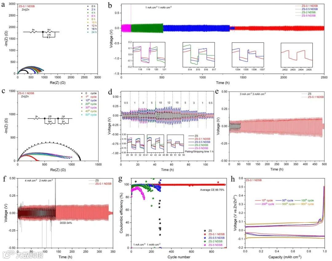 图3.(a)Zn||Zn对称电池静置不同时间后的电化学阻抗谱。(b)使用含不同剂量 NDSB添加剂的ZS电解液的Zn||Zn对称电池在1 mA cm-2电流密度和1 mAh cm-2面积容量下的电压曲线。(c)Zn||Zn对称电池在1 mA cm-2电流密度和1 mAh cm-2面积容量下进行不同次数沉积/剥离循环后的电化学阻抗谱。(d)使用含不同剂量NDSB添加剂的ZS电解液的Zn||Zn对称电池在不同电流密度下的恒电流锌沉积/剥离曲线。(e)使用ZS和ZS-0.1 NDSB电解液的Zn||Zn对称电池在3 mA cm-2电流密度和3 mAh cm-2面积容量下的电压曲线。(f)使用ZS和ZS-0.1 NDSB电解液的Zn||Zn对称电池在4 mA cm-2电流密度、4 mAh cm-2面积容量及34%高放电深度下的电压曲线。(g)使用含不同剂量 NDSB 添加剂的ZS电解液的Zn||Cu不对称电池在1 mA cm-2电流密度和1 mAh cm-2面积容量下的库仑效率。(h)使用ZS-0.1 NDSB电解液的电池在不同循环次数下的相应电压曲线。