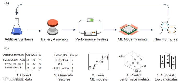 实战八:收集液态电解质添加剂电池系统中的性能数据,包括最终面积比阻抗、阻抗增量和比容量,基于分子结构信息,生成特征向量,通过数据收集、特征工程、模型训练与验证等机器学习流程,成功预测出最佳液态电解质添加剂组合。