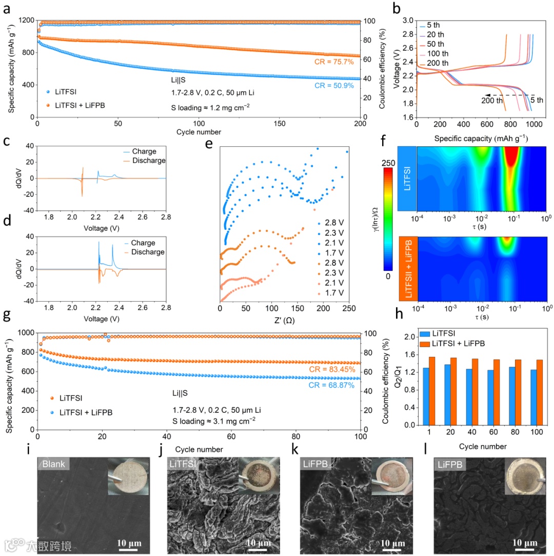 图5:不同电解质体系长循环性能比较。a) 硫载量为1.2 mg cm-2的Li-S电池循环性能(前3次0.1 C,后续0.2 C)。b) 含LiFPB电解液中Li-S电池的充放电曲线。不同电解液中循环100次后的dQ/dV曲线:c) 常规电解液。d) 含LiFPB电解液。e) 不同电压下Li-S电池的原位EIS谱;f) 对应电解液的原位EIS弛豫时间分布(DRT)γ(τ);g) 硫载量为3.1 mg cm-2的Li-S电池循环性能(前3次0.1 C,后续0.2 C);h) 不同循环次数下第二放电平台与第一放电平台的容量比(Q2/Q1);i) 新鲜锂金属的SEM形貌;j) 常规电解液中循环40次后锂金属的SEM形貌;k) 含LiFPB电解液中循环40次后锂金属的SEM形貌;l) 含LiFPB电解液中循环100次后锂金属的SEM形貌。