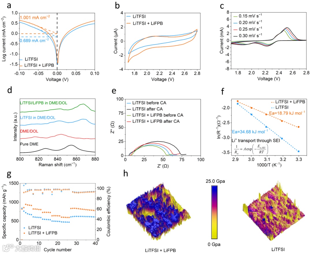 图4:LiFPB盐氧化还原性能评估。a) 基于不同电解液的 Li||Li 对称电池的 Tafel 曲线对比;b) Li||Cu 电池在传统电解液与含 LiFPB 电解液中的循环伏安 (CV) 曲线对比(扫描速率:0.2 mV s-1);c) Li||S 电池在含 LiFPB 电解液中不同扫描速率下的 CV 曲线;d) 拉曼光谱对比:纯 DME 溶剂、DME/DOL 混合溶剂、LiTFSI-DME/DOL 电解液及 LiTFSI+LiFPB-DME/DOL 电解液;e) 不同电解液体系在直流极化处理前后的电化学阻抗谱 (EIS) 分析;f) 基于阿伦尼乌斯方程拟合获得的 SEI 膜中 Li⁺ 传输活化能;g) 不同电解液体系的锂硫电池倍率性能对比;h) 循环后锂金属负极表面的杨氏模量原子力显微镜(AFM)图像对比。