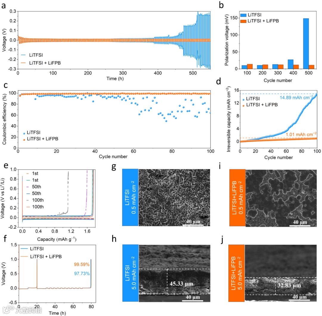 图2:Li||Cu 半电池和 Li||Li 对称电池体系,对 LiFPB 盐的电化学性能的系统评估。a) 不同电解液体系中,Li||Li 对称电池在 0.5 mA cm-2电流密度、1 mAh cm-2 沉积/剥离容量下的电压-时间曲线;b) 不同电解液体系的 Li||Li 对称电池在不同循环圈数下的极化电压;c) 不同电解液体系中,Li||Cu 电池在 0.5 mA cm-2 电流密度、1 mAh cm-2 沉积容量下的库仑效率;d) 不同电解液体系在前 100 次循环中的累积不可逆容量(基于 Li||Cu 电池);e) 不同电解液体系的 Li||Cu 电池代表性循环电压曲线(虚线:常规电解液;实线:含 LiFPB 电解液);f) Li||Cu 半电池的 Aurbach库伦效率测试结果;g, h) 常规电解液体系下,不同面容量首次循环后锂沉积形貌的SEM 图像(俯视图与截面图);i, j) 含 LiFPB 电解液体系下,不同面容量首次循环后锂沉积形貌的SEM 图像(俯视图与截面图)。