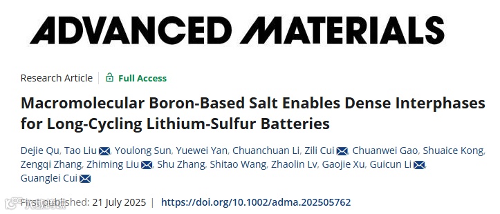 D. Qu, T. Liu, Y. Sun, Y. Yan, C. Li, Z. Cui, C. Gao, S. Kong, Z. Zhang, Z. Liu, S. Zhang, S. Wang, Z. Lv, G. Xu, G. Li, G. Cui, Macromolecular Boron-Based Salt Enables Dense Interphases for Long-Cycling Lithium-Sulfur Batteries. Adv. Mater. 2025, e05762.