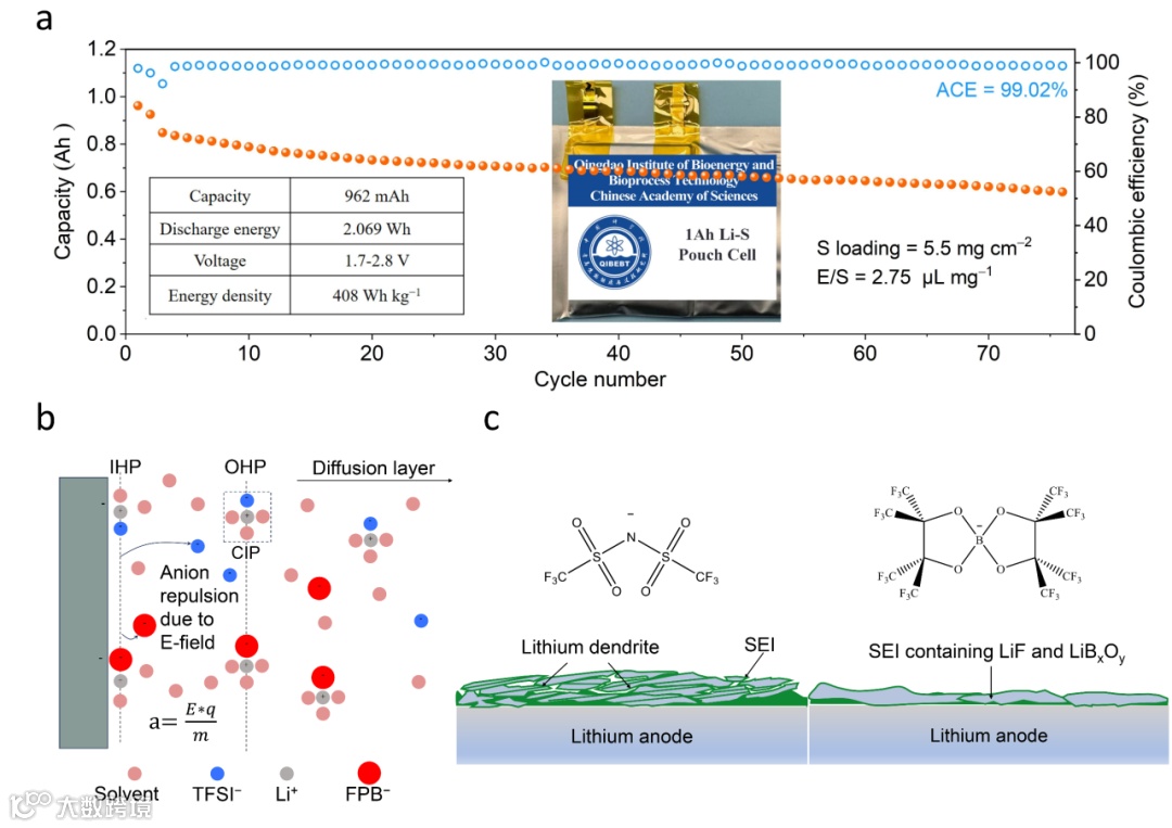 图6:含LiFPB盐电解质实际应用潜力。a) Ah级Li-S软包电池的循环性能(硫载量5.5 mg cm-2,E/S=2.75 μL mg-1)。b) 施加电场下内亥姆霍兹层中阴离子排斥的示意图。c) LiFPB盐保护锂金属负极的机制示意图。