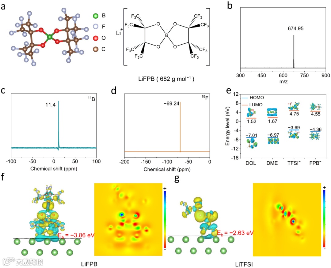 图1:LiFPB盐的特性。a) LiFPB 的化学结构;b) LiFPB 阴离子物种的质谱图;c) LiFPB 在氘代二甲基亚砜(DMSO-d6)中的 11B NMR 谱图;d) LiFPB 在氘代二甲基亚砜(DMSO-d6)中的19F NMR 谱图;e) DOL、DME、TFSI- 阴离子及 FPB- 阴离子的 HOMO 与 LUMO 能级计算结果;f,g) LiFPB 与 LiTFSI 在锂金属表面的原子构型,并给出相应的结合能及差分电荷密度分布。