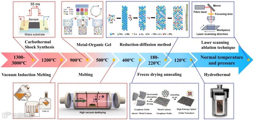在各种制备方法中,合成温度(高温合成、中温合成、低温合成、常温合成)是关键,直接影响电催化剂的组成分布、晶体结构和电子结构,从而显著影响其催化性能(图2)。例如,高温合成(例如,1300-3000 °C)可以促进原材料之间的扩散和反应,促进了更均匀的合金结构的形成,但过高的温度会导致元素偏析或挥发,破坏所需的均匀电子结构。因此,开发中温合成(例如,500-1300 ℃)和低温合成(例如,100-500 °C)条件具有重要意义,因为它们可以有效降低能耗,并有助于保持材料微观结构的稳定性。但是温度过低导致的不完全扩散,可能导致局部成分波动以及整个材料的局部电子结构的变化。此外,常温合成(例如,激光扫描烧蚀)为制备HEMs提供了一种新的途径,其能够在温和的条件下实现多种元素的均匀混合和高效催化性能的调制。