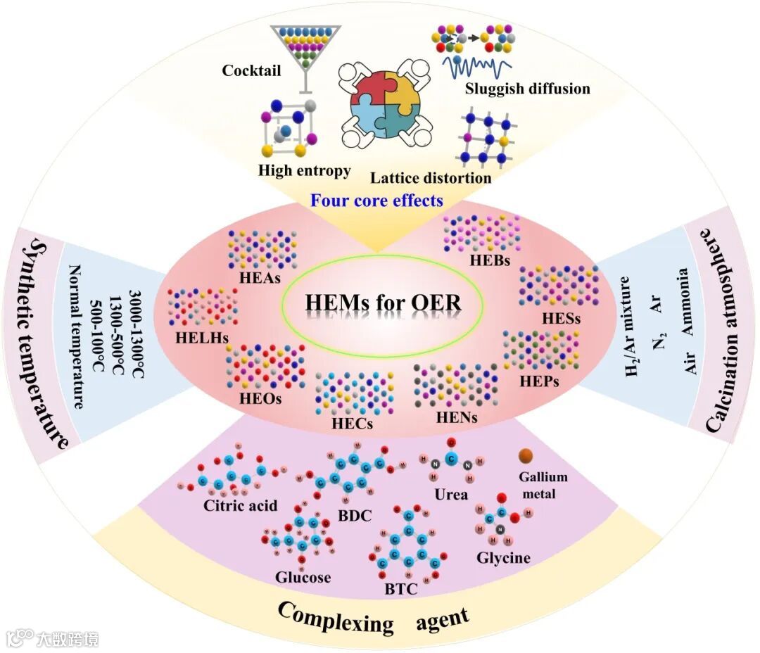 高熵材料(HEMs)作为一种含有五种或更多接近等摩尔的元素构成的新型材料,凭借其独特的结构复杂性和卓越的催化性能,近年来在电解水催化领域受到了广泛关注。大量研究表明,HEMs电催化剂展现出可与贵金属相媲美的优异的催化活性,为其替代传统贵金属催化剂提供了可能。尽管目前已有若干综述对HEMs的研究进展进行了总结,但主要集中在HEMs的合成方法、组分设计和四大核心效应等基础性内容,而对合成方法中的关键因素(络合剂、合成温度、煅烧气氛)的选择、不同高熵组分对析氧反应(OER)的影响机理及四大核心效应在OER过程中的作用机制等方面的研究尚未见报道。鉴于此,有必要对合成方法中的关键因素、组分与活性之间的相关性以及四大核心效应的电催化影响机制进行全面、明确和分析性的综述,为高性能HEMs电催化剂的设计与开发提供理论指导。