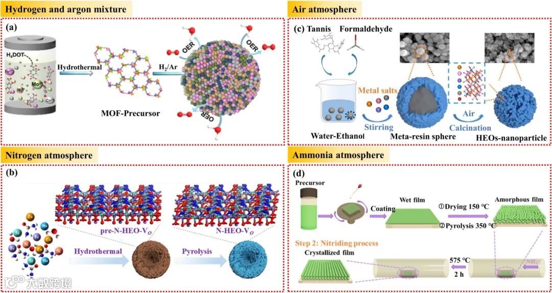煅烧气氛(氢气/氩气混合气、空气、氩气、氨气)也是制备高熵材料的关键因素,对材料的晶体结构、相组成和最终性能有重要影响(图3)。例如,在H2/Ar中,氢表现出强还原性,促进金属氧化物还原以形成高熵合金(HEAs)并促进均匀的元素分布。在空气中,金属前体与氧气反应产生高熵氧化物(HEOs),其通常包含丰富的氧空位和缺陷结构,从而增强材料的催化活性。此外,氨气(NH3)通常用来合成高熵氮化物(HENs),其中氮化反应可以调节材料的电子结构和表面化学。