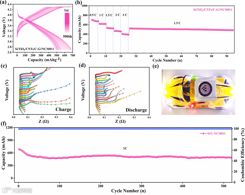 将所制备材料组装成容量为0.7 Ah的软包电池,并对其电化学性能进行系统评估。软包电池的能量密度可达320 Wh·kg-1,在1 C电流密度下经过500次循环后,电池仍保持超过0.5 Ah的可逆容量,充分体现了其长期循环稳定性。即便在3C高倍率条件下,电池仍能够提供接近0.4 Ah的容量,并在低电流密度时快速回升,表现出优异的倍率性能与结构可逆性。