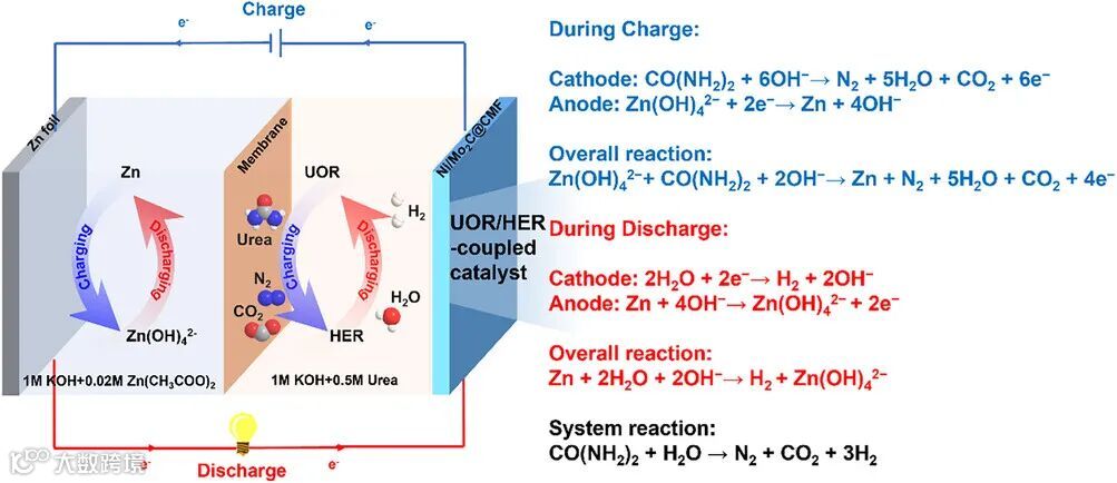 图1. 通过解耦UOR和HER分解尿素产生氢气的锌尿素电池示意图。