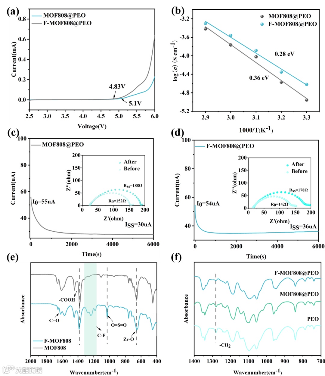 为了验证氟化改性对聚合物电解质离子传输性能的提升,我们通过对比实验发现:氟化后的F-MOF808@PEO电解质在所有测试温度下均表现出更高的离子电导率和更低的离子迁移活化能,其锂离子迁移数也从0.21提高至0.43,电化学稳定窗口扩展至5.1 V。谱学分析表明,氟化基团通过抑制聚合物结晶、促进锂盐解离和增强界面相互作用,有效优化了离子传输路径与导锂机制。