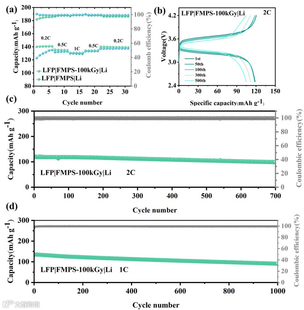 图5. Li|FMPS-100kGy|LFP全电池循环性能和倍率性能
