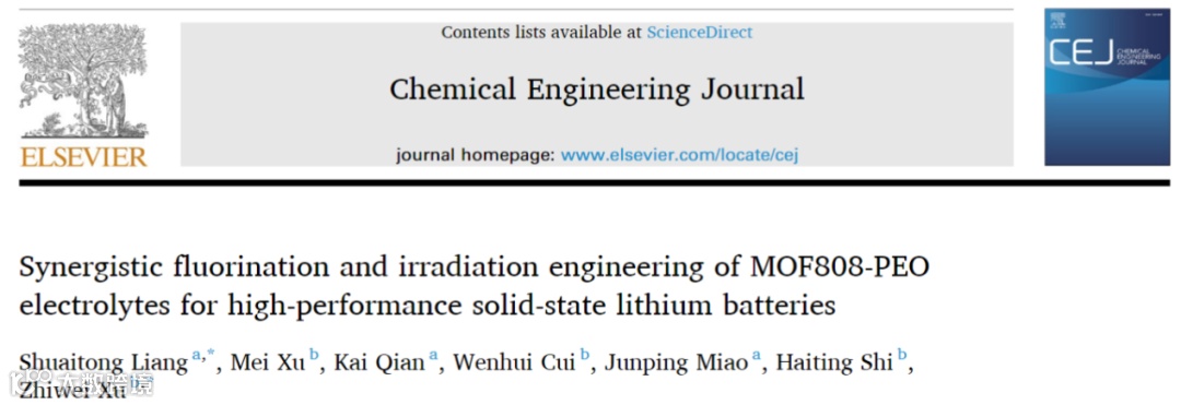 基于此,来自天津工业大学徐志伟教授团队在国际知名期刊《Chemical Engineering Journal》上发表题为“Synergistic Fluorination and Irradiation Engineering of MOF808-PEO Electrolytes for High-Performance Solid-State Lithium Batteries”的论文。