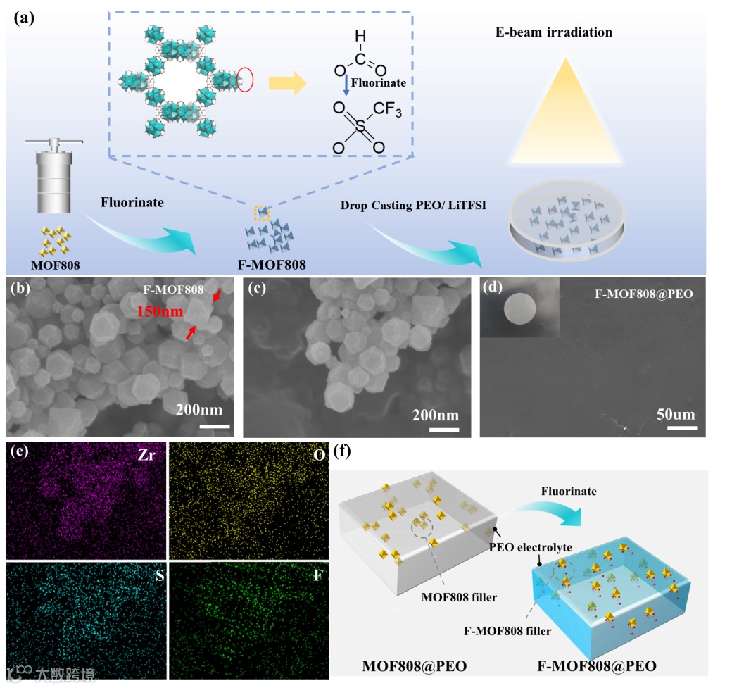 首先采用水热法合成正八面体结构的MOF808,然后经氟化改性得到F-MOF808晶体颗粒,最后将F-MOF808分散于PEO基质溶液,通过溶液流延成型工艺制备F-MOF@PEO复合电解质。