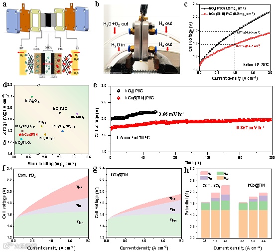 图6. (a) PEM电解槽示意图。(b) PEM电解槽实物照片。(c)PEM电解槽极化曲线。(d) IrCo@TiN电解槽和先前报道的Ir基电解槽电压比较。(e) PEM电解槽的计时电位测试。(f) 商业化IrO2和(g)IrCo@TiN PEM电解槽极化曲线的各种过电位贡献分析。(h)不同PEM电解槽过电位贡献比较。