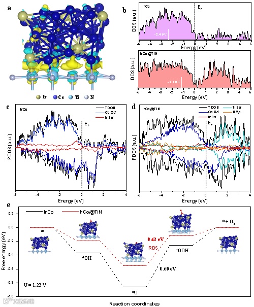 图5. (a) IrCo@TiN的差分电荷密度图。(b) IrCo@TiN和未负载IrCo合金的d带中心分析比较。(c) 未负载IrCo合金和(d) IrCo@TiN的PDOS分析比较。(e) 未负载IrCo合金和IrCo@TiN催化剂OER反应自由能图。